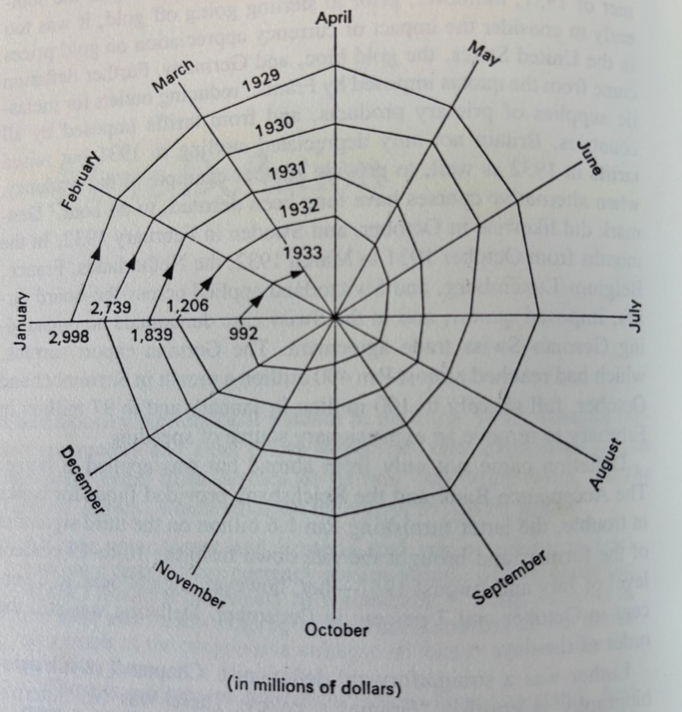 A contração do comércio global: importações de 75 países, de jan/1929 a mar/1933, em milhões de dólares. Fonte: Kindleberger, C.P. “The World in Depression 1929-1939”.